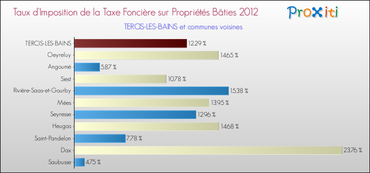 En 2012, le taux de la taxe foncière sur le bâti vôté par le conseil municipal de Tercis-les-Bains était de : 12.29 %.