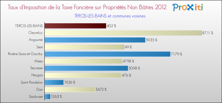 Pendant la même période, les communes françaises similaires à Tercis-les-Bains, ont vu leur taux de taxe foncière sur le non bâti augmenter de 14.97 % en moyenne entre 2000 et 2012.