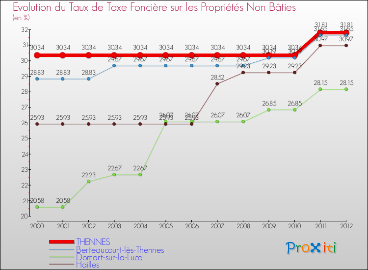 En 2012, le taux de la taxe foncière sur le non bâti vôté par le conseil municipal de Thennes était de : 31.81 %.