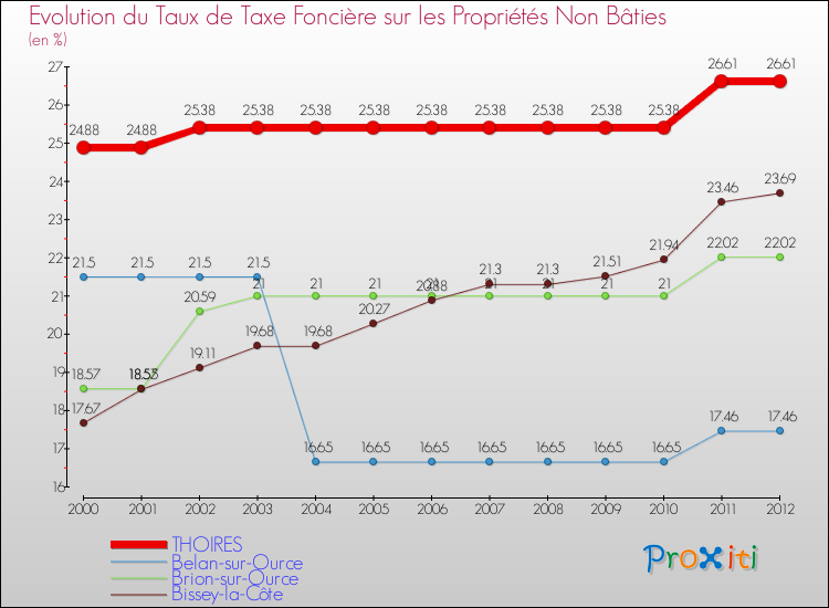 En 2012, le taux de la taxe foncière sur le non bâti vôté par le conseil municipal de Thoires était de : 26.61 %.