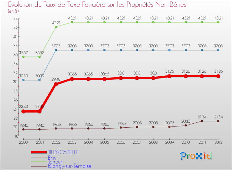 Pendant la même période, les communes françaises similaires à Tilly-Capelle, ont vu leur taux de taxe foncière sur le non bâti augmenter de 48.39 % en moyenne entre 2000 et 2012.