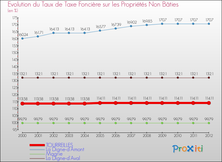 Pendant la même période, les communes françaises similaires à Tourreilles, ont vu leur taux de taxe foncière sur le non bâti augmenter de 25.51 % en moyenne entre 2000 et 2012.