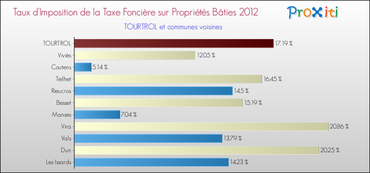 En 2012, le taux de la taxe foncière sur le bâti vôté par le conseil municipal de Tourtrol était de : 17.19 %.
