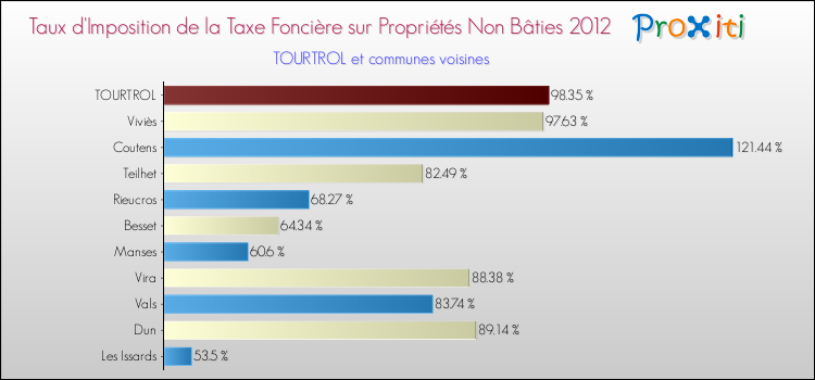 En 2012, le taux de la taxe foncière sur le non bâti vôté par le conseil municipal de Tourtrol était de : 98.35 %.