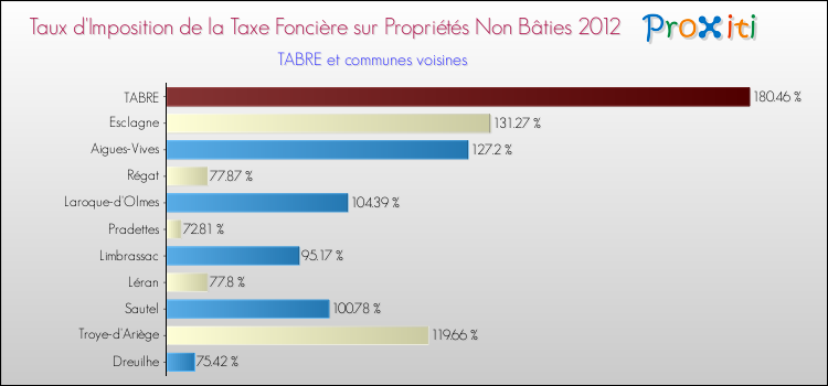 En 2012, le taux de la taxe foncière sur le non bâti vôté par le conseil municipal de Tabre était de : 180.46 %.