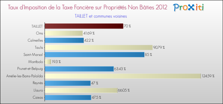 En 2012, le taux de la taxe foncière sur le non bâti vôté par le conseil municipal de Taillet était de : 70 %.