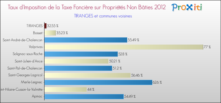 En 2012, le taux de la taxe foncière sur le non bâti vôté par le conseil municipal de Tiranges était de : 32.55 %.