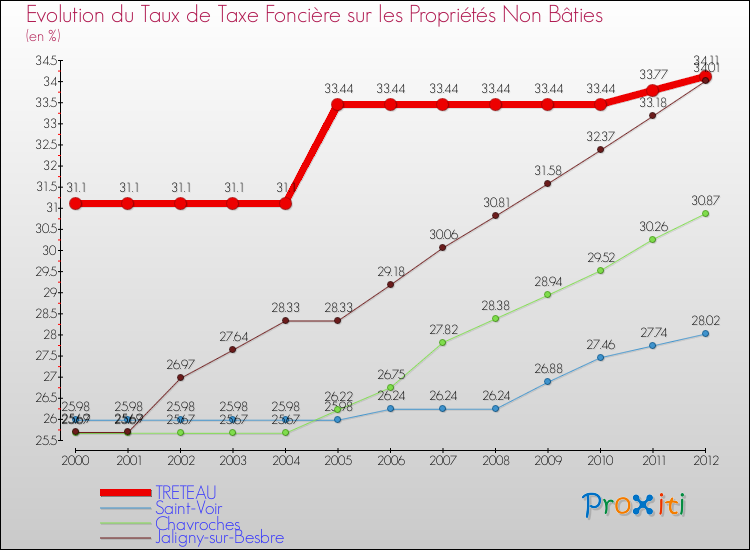 En 2012, le taux de la taxe foncière sur le non bâti vôté par le conseil municipal de Treteau était de : 34.11 %.