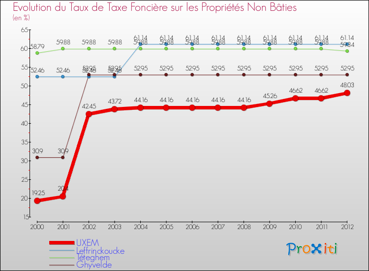 Pendant la même période, les communes françaises similaires à Uxem, ont vu leur taux de taxe foncière sur le non bâti augmenter de 26.66 % en moyenne entre 2000 et 2012.