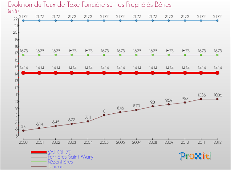 En 2012, le taux de la taxe foncière sur le bâti vôté par le conseil municipal de Valjouze était de : 14.14 %.