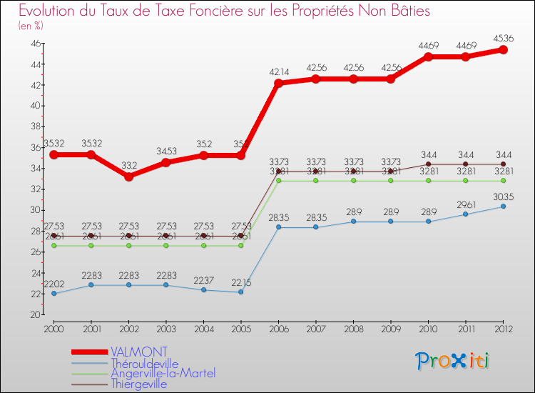 Pendant la même période, les communes françaises similaires à Valmont, ont vu leur taux de taxe foncière sur le non bâti augmenter de 26.66 % en moyenne entre 2000 et 2012.