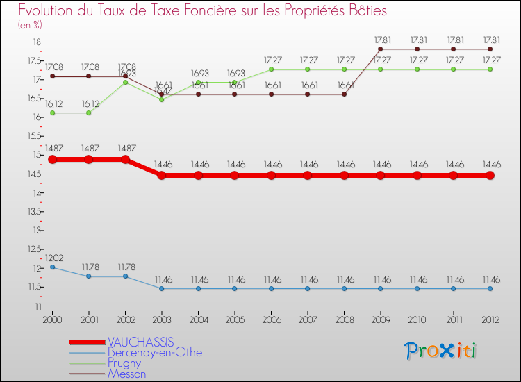 En 2012, le taux de la taxe foncière sur le bâti vôté par le conseil municipal de Vauchassis était de : 14.46 %.