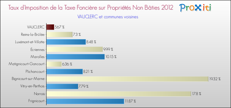 En 2012, le taux de la taxe foncière sur le non bâti vôté par le conseil municipal de Vauclerc était de : 5.67 %.