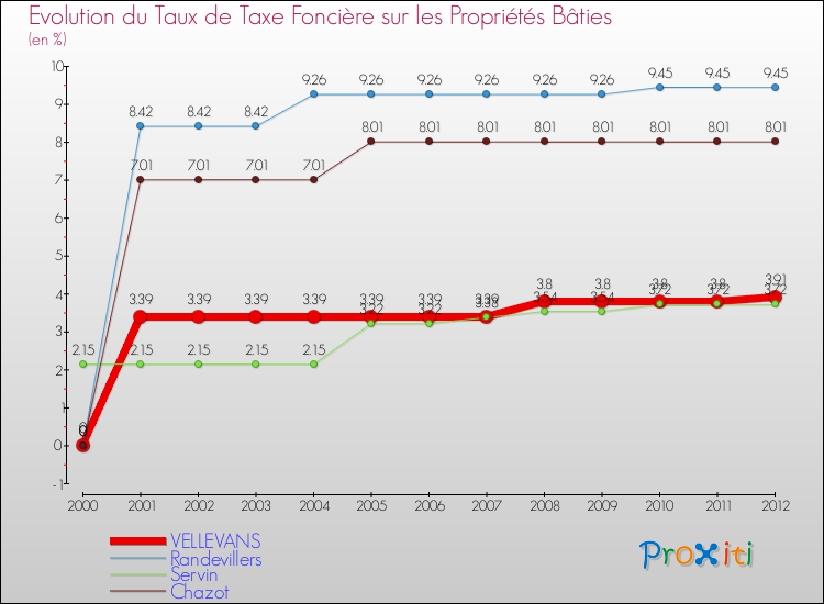 A Vellevans, le taux de taxe foncière sur le bâti a donc augmenté de 15.34 % entre 2000 et 2012.