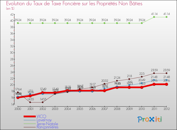 A Vicq, le taux de taxe foncière sur le non bâti a donc augmenté de 25.53 % entre 2000 et 2012.