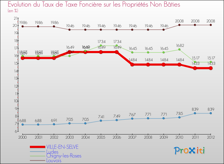 A Ville-en-Selve, le taux de taxe foncière sur le non bâti a donc baissé de 8.67 % entre 2000 et 2012.