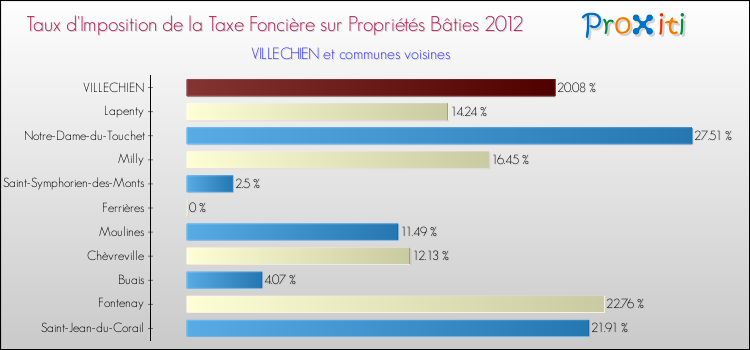 Pendant la même période, les communes françaises similaires à Villechien, ont vu leur taux de taxe foncière sur le bâti augmenter de 68.1 % en moyenne entre 2000 et 2012.