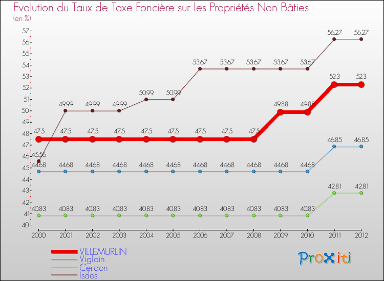 Pendant la même période, les communes françaises similaires à Villemurlin, ont vu leur taux de taxe foncière sur le non bâti augmenter de 27.44 % en moyenne entre 2000 et 2012.
