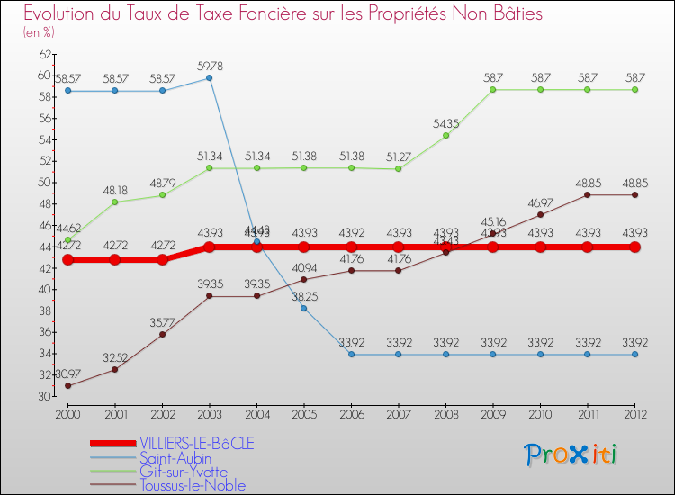 A Villiers-le-Bâcle, le taux de taxe foncière sur le non bâti a donc augmenté de 2.83 % entre 2000 et 2012.