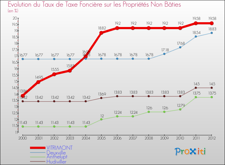 En 2012, le taux de la taxe foncière sur le non bâti vôté par le conseil municipal de Vitrimont était de : 19.58 %.