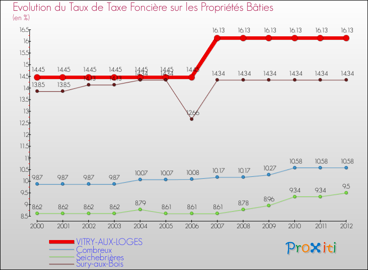 A Vitry-aux-Loges, le taux de taxe foncière sur le bâti a donc augmenté de 11.63 % entre 2000 et 2012.