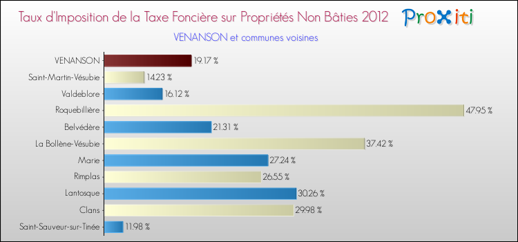 En 2012, le taux de la taxe foncière sur le non bâti vôté par le conseil municipal de Venanson était de : 19.17 %.