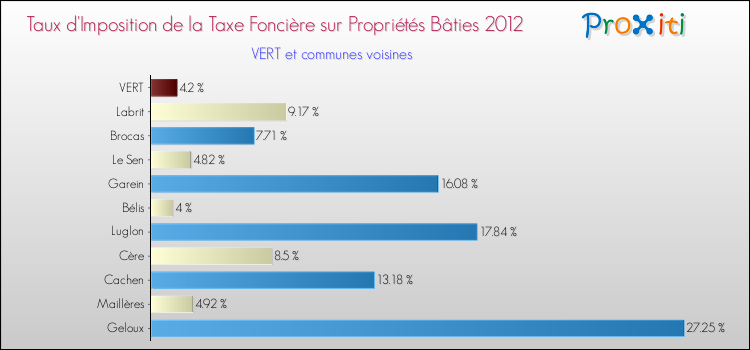 En 2012, le taux de la taxe foncière sur le bâti vôté par le conseil municipal de Vert était de : 4.2 %.