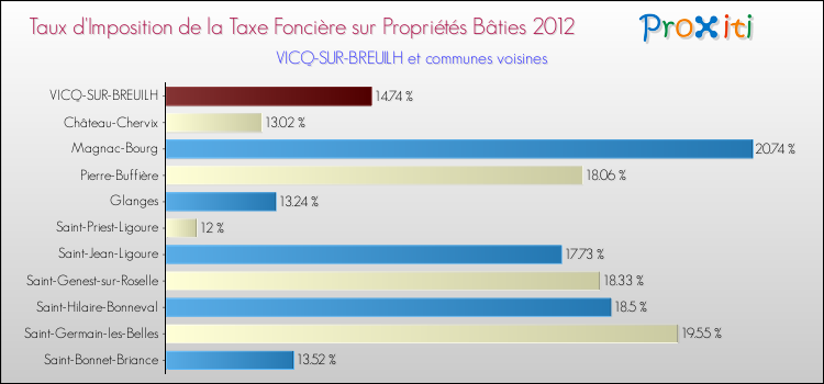 En 2012, le taux de la taxe foncière sur le bâti vôté par le conseil municipal de Vicq-sur-Breuilh était de : 14.74 %.