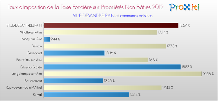 En 2012, le taux de la taxe foncière sur le non bâti vôté par le conseil municipal de Ville-devant-Belrain était de : 18.67 %.