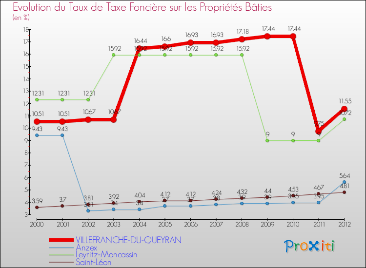 A Villefranche-du-Queyran, le taux de taxe foncière sur le bâti a donc augmenté de 9.9 % entre 2000 et 2012.