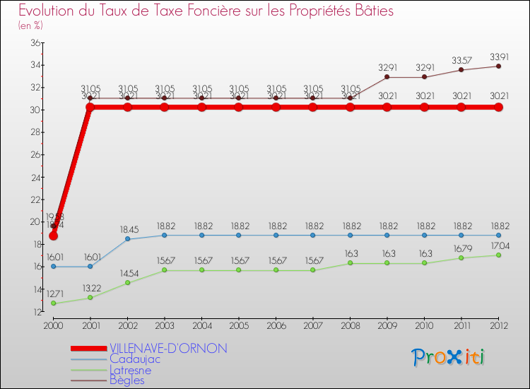 A Villenave-d'Ornon, le taux de taxe foncière sur le bâti a donc augmenté de 61.21 % entre 2000 et 2012.