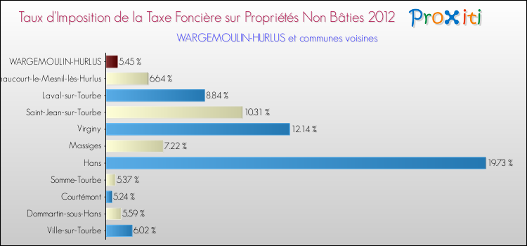 Vous trouverez ci-dessous des graphiques qui vous permettent de situer le taux de la taxe foncière sur le non bâti de Wargemoulin-Hurlus par rapport aux communes voisines.