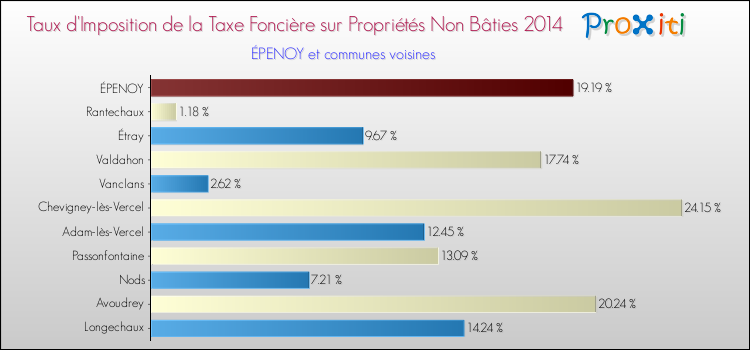 En 2014, le taux de la taxe foncière sur le non bâti vôté par le conseil municipal de Épenoy était de : 19.19 %.