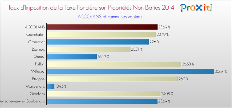 En 2014, le taux de la taxe foncière sur le non bâti vôté par le conseil municipal de Accolans était de : 23.69 %.