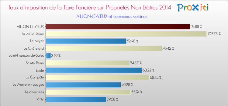 Vous trouverez ci-dessous des graphiques qui vous permettent de situer le taux de la taxe foncière sur le non bâti de Aillon-le-Vieux par rapport aux communes voisines.