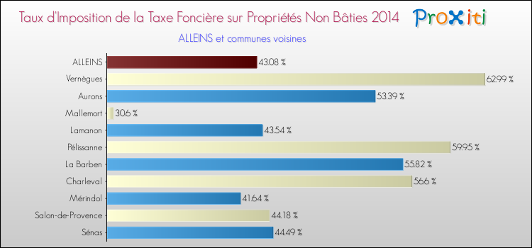 En 2014, le taux de la taxe foncière sur le non bâti vôté par le conseil municipal de Alleins était de : 43.08 %.