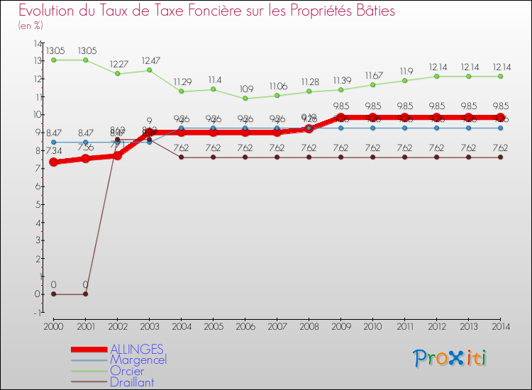 A Allinges, le taux de taxe foncière sur le bâti a donc augmenté de 34.2 % entre 2000 et 2014.