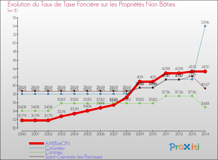 Pendant la même période, les communes françaises similaires à Ambléon, ont vu leur taux de taxe foncière sur le non bâti augmenter de 48.47 % en moyenne entre 2000 et 2014.
