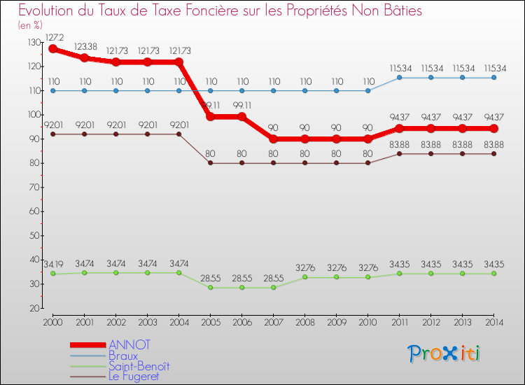Pendant la même période, les communes françaises similaires à Annot, ont vu leur taux de taxe foncière sur le non bâti baisser de 10.08 % en moyenne entre 2000 et 2014.