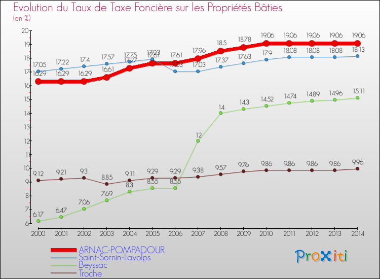 En 2014, le taux de la taxe foncière sur le bâti vôté par le conseil municipal de Arnac-Pompadour était de : 19.06 %.
