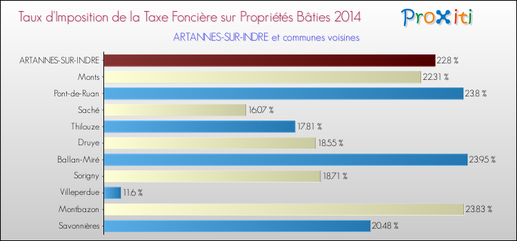 En 2014, le taux de la taxe foncière sur le bâti vôté par le conseil municipal de Artannes-sur-Indre était de : 22.8 %.