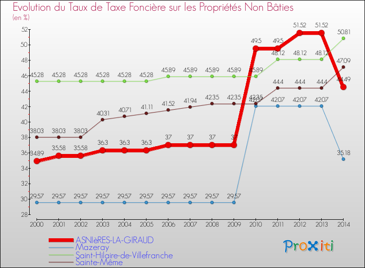 A Asnières-la-Giraud, le taux de taxe foncière sur le non bâti a ainsi augmenté de 27.52 % entre 2000 et 2014.