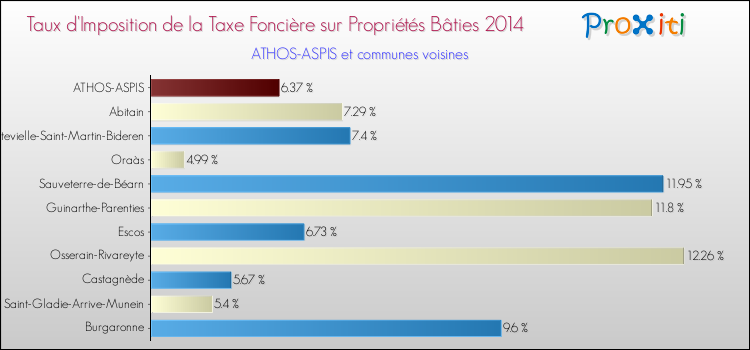 En 2014, le taux de la taxe foncière sur le bâti vôté par le conseil municipal de Athos-Aspis était de : 6.37 %.