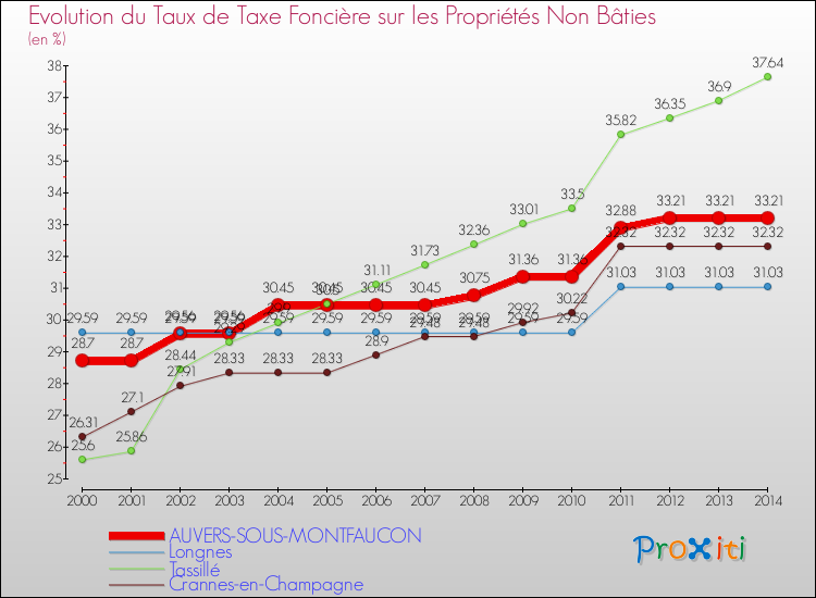 A Auvers-sous-Montfaucon, le taux de taxe foncière sur le non bâti a ainsi augmenté de 15.71 % entre 2000 et 2014.