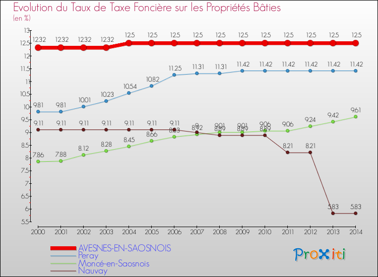 En 2014, le taux de la taxe foncière sur le bâti vôté par le conseil municipal de Avesnes-en-Saosnois était de : 12.5 %.