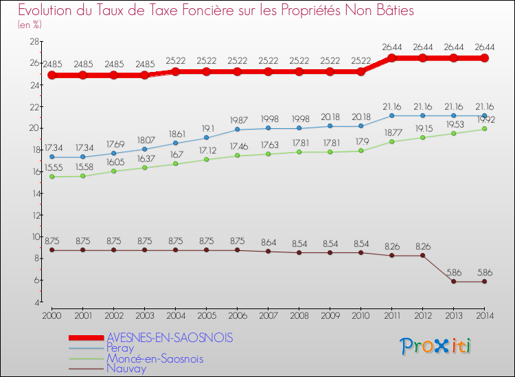 En 2014, le taux de la taxe foncière sur le non bâti vôté par le conseil municipal de Avesnes-en-Saosnois était de : 26.44 %.