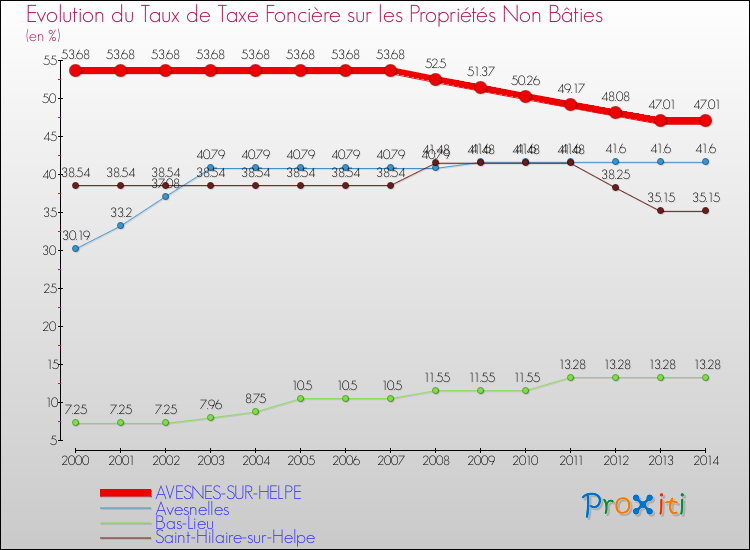 A Avesnes-sur-Helpe, le taux de taxe foncière sur le non bâti a ainsi baissé de 12.43 % entre 2000 et 2014.