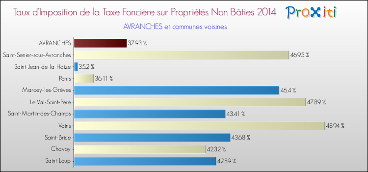 En 2014, le taux de la taxe foncière sur le non bâti vôté par le conseil municipal de Avranches était de : 37.93 %.