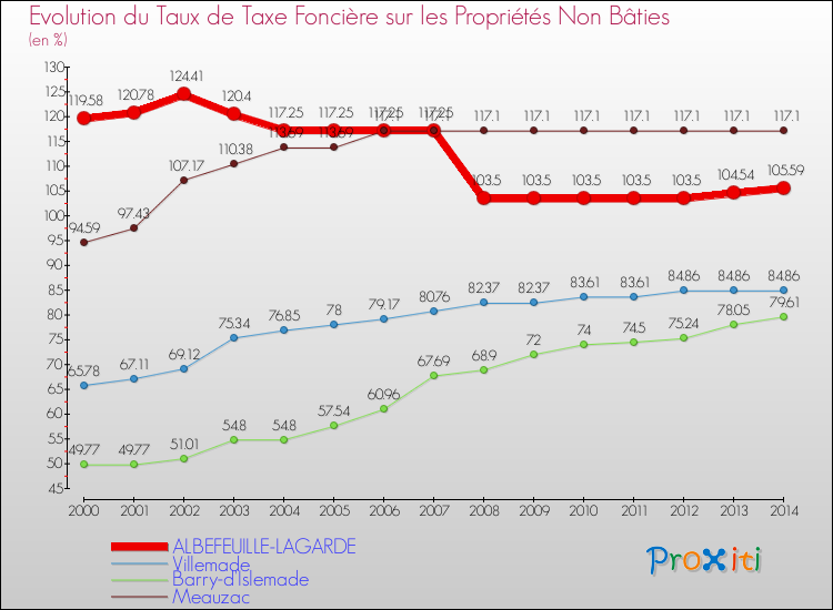 Pendant la même période, les communes françaises similaires à Albefeuille-Lagarde, ont vu leur taux de taxe foncière sur le non bâti augmenter de 13.27 % en moyenne entre 2000 et 2014.