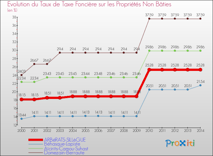 A Arbérats-Sillègue, le taux de taxe foncière sur le non bâti a ainsi augmenté de 39.28 % entre 2000 et 2014.